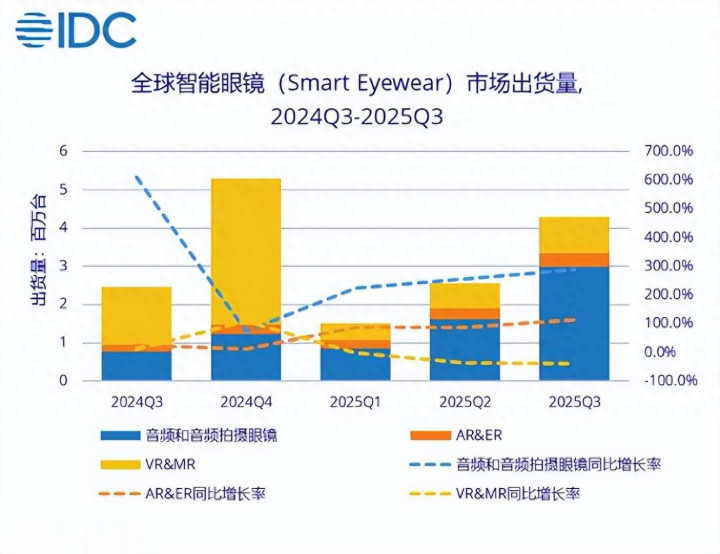 (映维网Nweon 2025年12月13日)IDC日前在《全球智能眼镜市场季度跟踪报告》中指出,对于2025年第三季度,全球范围内智能眼镜市场出货量429.6万台,同比增长74.1%;AR/VR市场出货130.2万台,同比下滑23.2%。